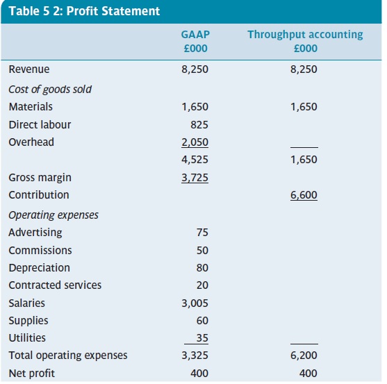 Looking at 1-4 above, you can see no attempt is made to allocate any overhead cost, so throughput accounting does not meet normal GAAP requirements. It does however raise the possibility of selling products/services at a price which is lower than under normal cost accounting, and it may also be useful for short-term decision making. Below is an example of a profit statements from Burns et al (2013. p. 112), which shows how throughput accounting produces a differing view on costing.